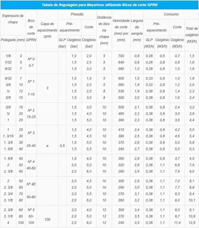 Esta tabela indica valores médios ao utilizar oxigênio de uma pureza mínima de 99,5% e cortando aço de até 0,3% de carbono. Para se obter cortes perfeitos é imprescindível utilizar bicos e capas em bom estado e para atingir a máxima velocidade da tabela, a chapa deve estar isenta de oxidação, carepas, pintura, etc. As pressões indicadas são sobrepressões medidas na entrada do maçarico.